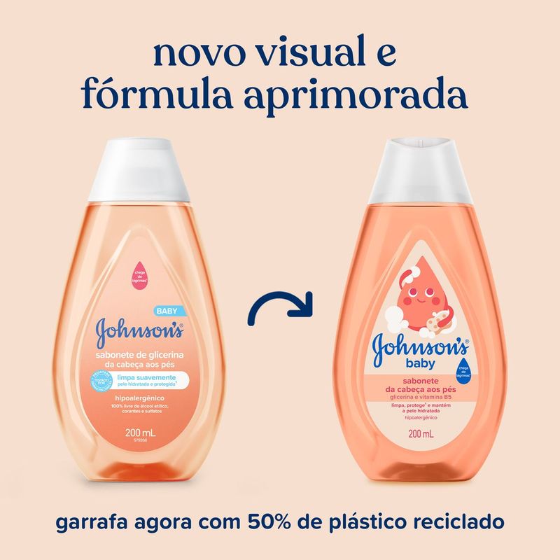 Cuide da pele do seu bebê com Sabonete Líquido de Glicerina JOHNSON’S® 3 em 1 que limpa, hidrata e protege a pele do ressecamento. Seguro desde o primeiro dia de vida, com a exclusiva fórmula CHEGA DE LÁGRIMAS®.