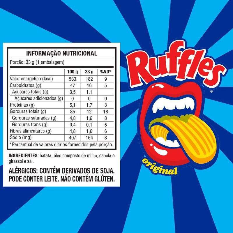 RUFFLES®, marca líder do mercado de batata chips no Brasil, é a batata que une todo mundo no pacote há mais de 30 anos. Feita de batata de verdade, com muita crocância e sabor, o portfólio de RUFFLES® conta com as versões original, cebola e salsa, churrasco e queijo. Mas fique ligado nas páginas da marca, porque novos sabores são frequentes. Então chama seus amigos e abre uma Ruffles ® – disponível nas gôndolas dos principais varejistas de todo o Brasil. Você sabia? O ar nas embalagens de Ruffle