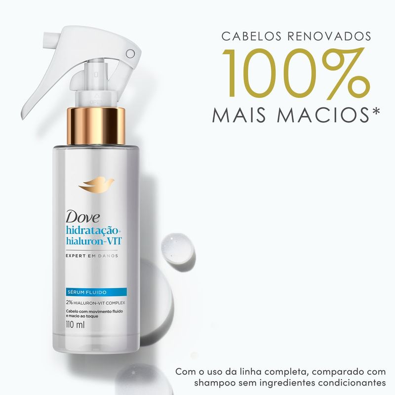 • O Dove Sérum Capilar Hidratação + Hialuron-VIT 110ml hidrata profundamente os fios, deixando-os 100% mais macios* e revitalizados, sendo ideal como finalizador para cabelos secos e sem maleabilidade • Com 2% Hialuron-VIT Complex, este finalizador é enriquecido com ácido hialurônico e vitamina, garante hidratação dos fios, restaura a leveza e o movimento fluido sem pesar, ideal para uso diário e finalização com ou sem calor • O sérum capilar leve para hidratação prolongada devolve a leveza e maciez ao toque enquanto ajuda a proteger contra danos externos • Formulado com ácido hialurônico e vitamina, o Dove Sérum Fluido Hialuron-VIT repara a fibra capilar e reduz os sinais visíveis de ressecamento • Dermatologicamente testado e cruelty-free, o Sérum Capilar Dove é prático e versátil, podendo ser usado tanto nos cabelos úmidos quanto secos, para resultados incríveis em qualquer momento do dia • Ideal para cabelos secos, danificados ou sem maleabilidade, com ação leve e eficaz para uso diário Descubra o inovador Dove Sérum Fluido Hidratação + Hialuron-VIT, desenvolvido para proporcionar hidratação prolongada e nutrição intensa para cabelos secos e sem maleabilidade. Enriquecido com 2% Hialuron-VIT Complex, sua fórmula combina ácido hialurônico e vitamina, repõe a hidratação para fios 100% mais macios, sem pesar*. Perfeito para quem busca combater os sinais de ressecamento e opacidade, este sérum capilar leve para hidratação prolongada é ideal para uso como finalizador. Ele não só hidrata profundamente como também cria uma barreira protetora contra danos externos, oferecendo um tratamento contínuo para os fios. Com tecnologia bio-protein, o Dove Sérum Fluido restaura a fibra capilar e facilita o desembaraço, tornando-se indispensável para a rotina de cuidados capilares. Indicado para todos os tipos de cabelo, especialmente os secos e danificados, ele é versátil e prático, podendo ser utilizado tanto no dia a dia quanto em um cronograma capilar na etapa de hidra
