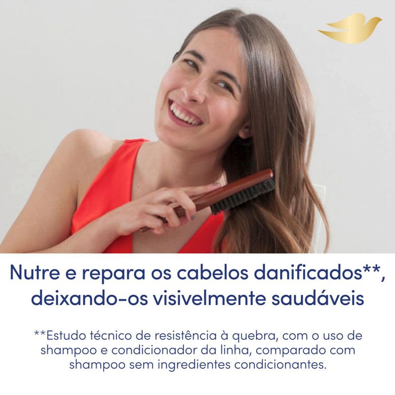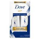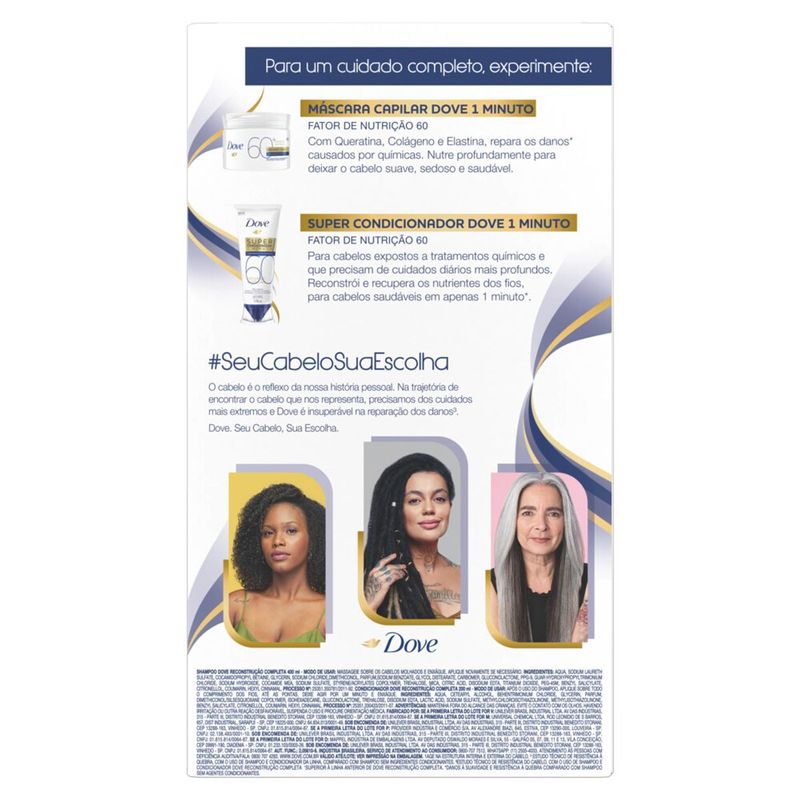 • O Kit de Shampoo e Condicionador Dove Reconstrução Completa* nutre e reconstrói o cabelo, evitando 90% dos danos antes que eles aconteçam*** • Shampoo e condicionador ideais para cabelos danificados, pois identificam e reparam os danos recorrentes dos fios para uma revitalização e hidratação profunda desde o primeiro uso • A fórmula do shampoo e condicionador restaura danos da superfície enquanto nutre profundamente os fios, trazendo maciez e fortificando seus cabelos • Contém ativos reparadores de queratina capilar, que nutrem o cabelo e o fortalecem para protegê-lo por dentro e torná-lo mais resistente a danos futuros • Massageie o shampoo hidratante sobre os cabelos molhados e enxágue. Após o uso do shampoo, aplique o condicionador sobre todo o comprimento dos fios até às pontas. Deixe agir por um minuto e enxágue • Com os produtos de cabelo da linha Dove Reconstrução Completa* seus cabelos vão ficar reparados, nutridos e protegidos diariamente A linha Dove Reconstrução Completa* é ideal para cabelos danificados, trazendo fórmula superior** para nutrir e reparar seus fios. O Kit de Shampoo e Condicionador restaura danos da superfície enquanto nutre e reconstrói o cabelo, evitando 90% dos danos antes que eles aconteçam***. A linha Reconstrução Completa* contém ativos reparadores de queratina capilar, que progressivamente nutrem o cabelo e o fortalecem para protegê-lo por dentro e torná-lo mais resistente a danos futuros. O reparo superior é obtido através de uma nova tecnologia de reparo que permite identificar as áreas do cabelo mais danificadas e fornecer maior reparo às áreas que mais precisam. Dúvidas de como usar? É simples e prático: Massageie o shampoo sobre os cabelos molhados e enxágue. Após o uso do shampoo, aplique o condicionador sobre todo o comprimento dos fios até às pontas. Deixe agir por um minuto e enxágue. O Kit Shampoo e Condicionador é adequado para uso diário. Dove acredita que beleza é para todos, e que seu cabelo tem papel fundame