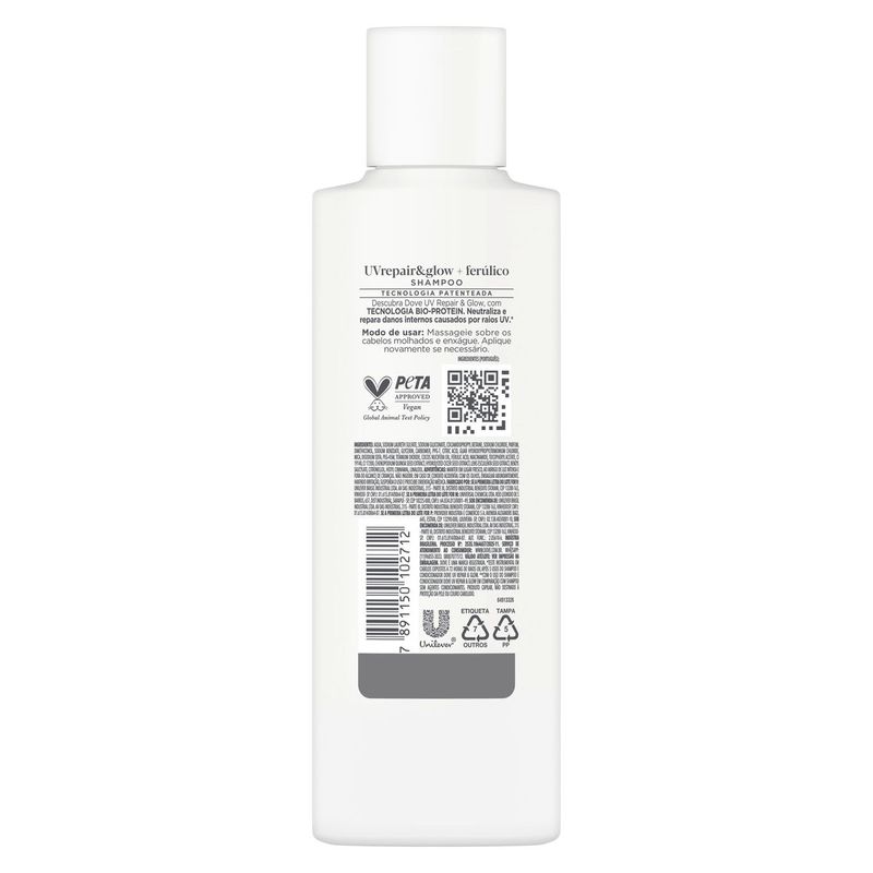 • Dove Shampoo UV Repair & Glow + Ferúlico repara até 99% dos danos causados pelos raios UV*. • Desenvolvido para restaurar força, brilho e vitalidade aos cabelos opacos, sem vida e danificados pela exposição aos raios UV. • Formulado com a tecnologia Bio Protein e Sérum Ferúlico, neutraliza e repara danos internos causados por raios UV. • Com Sérum Ferúlico, sua fórmula repara as fibras danificadas por raios UV e revela 10x mais brilho nos cabelos por até 120 horas**. • Shampoo especialmente desenvolvido para cabelos danificados, proporcionando uma limpeza eficaz. • *Teste instrumental em cabelos expostos a 72 horas de raios UV, após 5 usos do shampoo e condicionador Dove UV Repair & Glow. **Com o uso do shampoo e condicionador Dove UV Repair & Glow em comparação com shampoo sem agentes condicionantes. O Dove Shampoo UV Repair & Glow + Ferúlico foi desenvolvido especialmente para quem busca um shampoo com ação reparadora para danos causados pelos raios UV. A exposição contínua ao sol e aos raios UV causa perda de proteína na fibra capilar até 4x mais intensa que o calor de ferramentas térmicas, resultando em cabelos opacos, porosos e quebradiços. Com a nova e exclusiva tecnologia UV Ferúlico, Dove atua como um verdadeiro escudo contra os danos solares, reparando até 99% dos danos acumulados por raios UV*. Além disso, o Sérum Ferúlico, conhecido por seu alto poder antioxidante no cuidado facial, é agora utilizado pela primeira vez para proteger e recuperar o cabelo, oferecendo 10x mais brilho nos cabelos por até 120 horas**. Além de reparar os fios, o shampoo também devolve brilho e maciez sem pesar. Sua fragrância sofisticada, inspirada em perfumaria fina, traz notas de flores brancas, cítricos e baunilha cremosa, promovendo uma experiência sensorial marcante a cada lavagem. *Com o uso regular da linha completa. Resultados podem variar conforme o tipo de cabelo e grau de dano. Testado dermatologicamente. Produto PETA Vegan. *Danos causados por rai