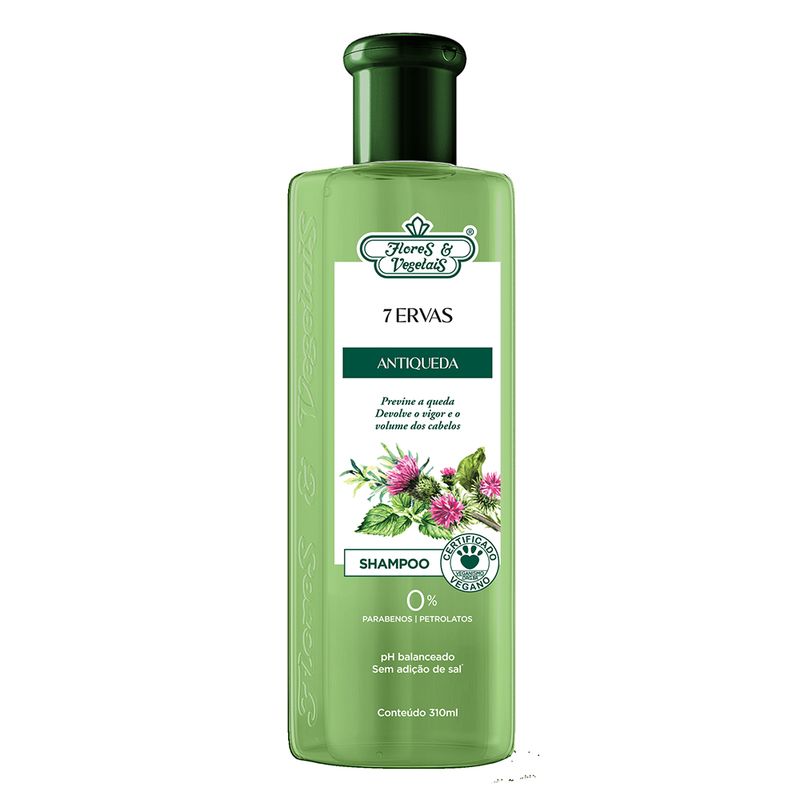 O Shampoo Sete Ervas Antiqueda Flores & Vegetais, possui fórmula com complexo vegetal ativo (Bardana, Capsicum, Hipérico, Mutamba, Quina, Mirra, Zimbro) que reúne todas as propriedades necessárias para tratar cabelos com problemas relacionados à queda. Lava com suavidade sem irritar o couro cabeludo, permite o uso frequente, dá vigor, volume e beleza aos cabelos, deixando-os com aspecto saudável e natural.