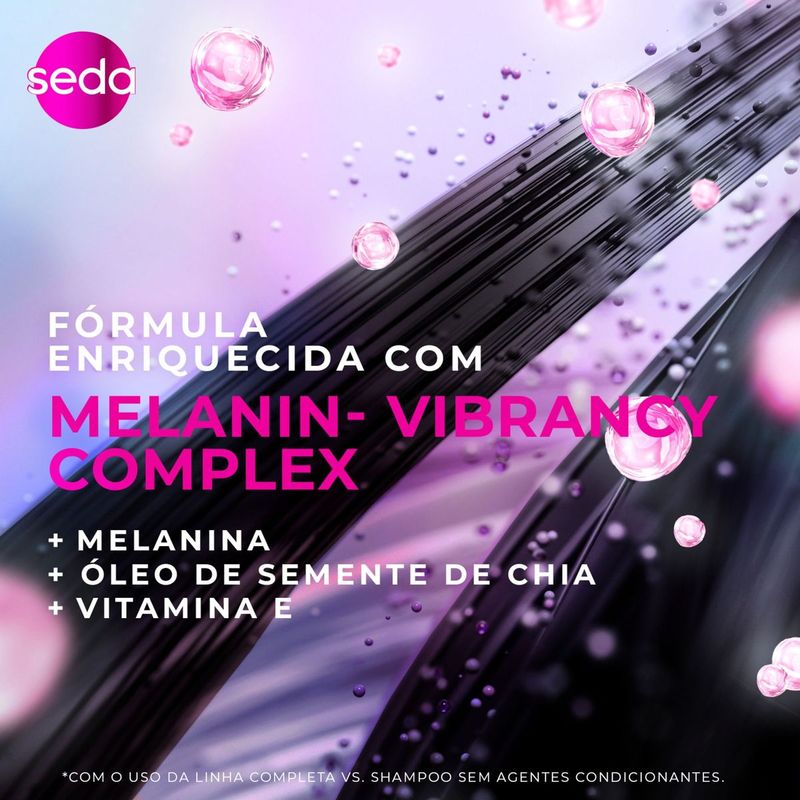• Fórmula com Melanin-Vibrancy Complex, melanina, óleo de semente de chia e vitamina E. • Promove cabelos pretos mais radiantes*. Seda Pretos Luminosos é a escolha ideal para quem deseja cabelos pretos brilhantes. Enriquecido com Melanin-Vibrancy Complex, um poderoso mix com melanina, óleo de semente de chia e vitamina E, este produto prepara os fios para as próximas etapas, garantindo mais brilho e aumentando a vivacidade da cor. Pode ser usado diariamente, pois não pesa nos fios. MODO DE USO: Este shampoo Seda deve ser aplicado no cabelo molhado, massageando suavemente e enxaguado. Experimente toda a linha SEDA Pretos Luminosos, uma linha desenvolvida para cabelos pretos.